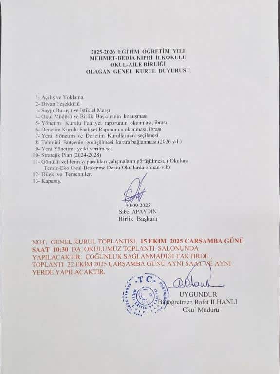 Okul Aile Birliği Olağan Genel Kurul Duyurusu